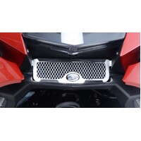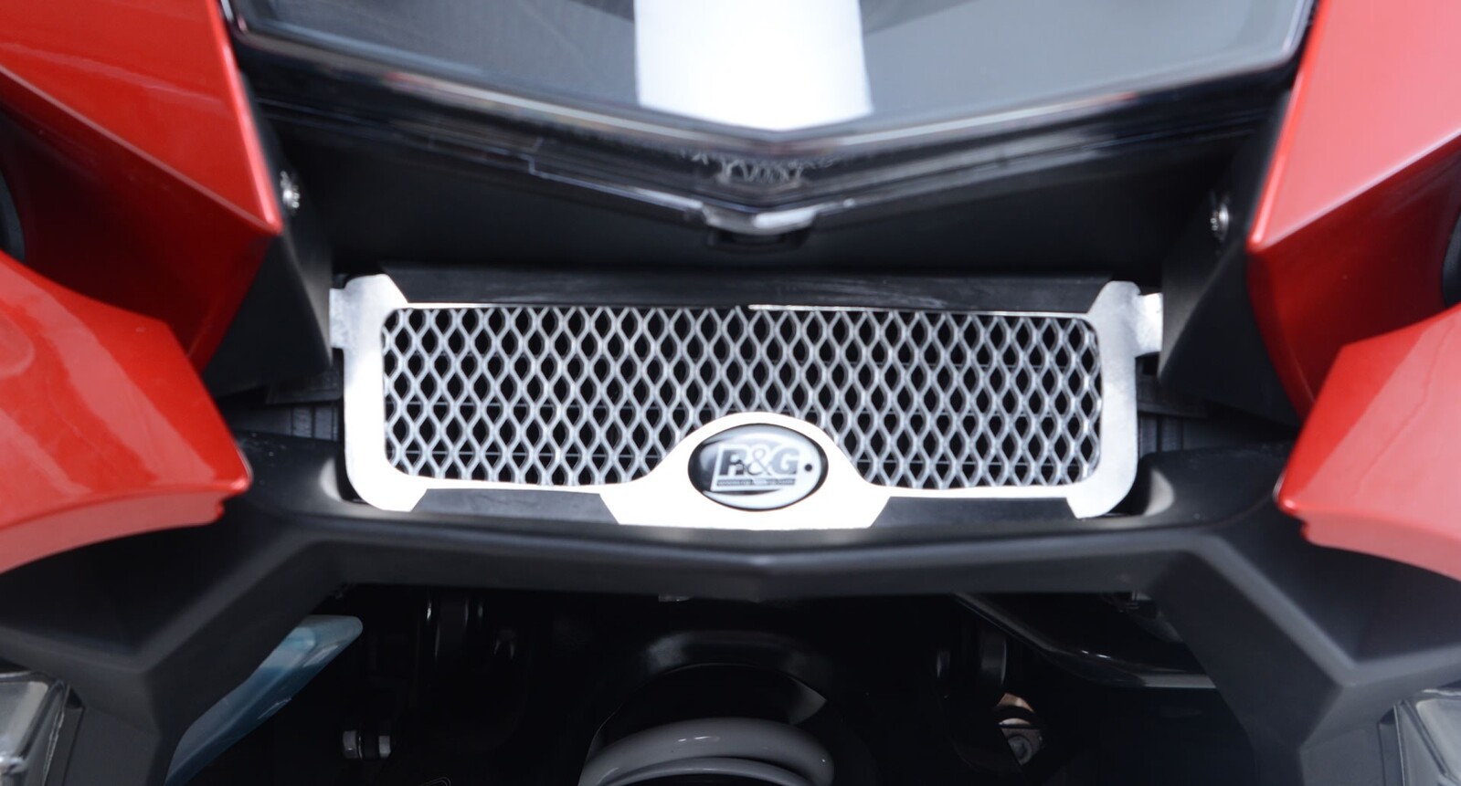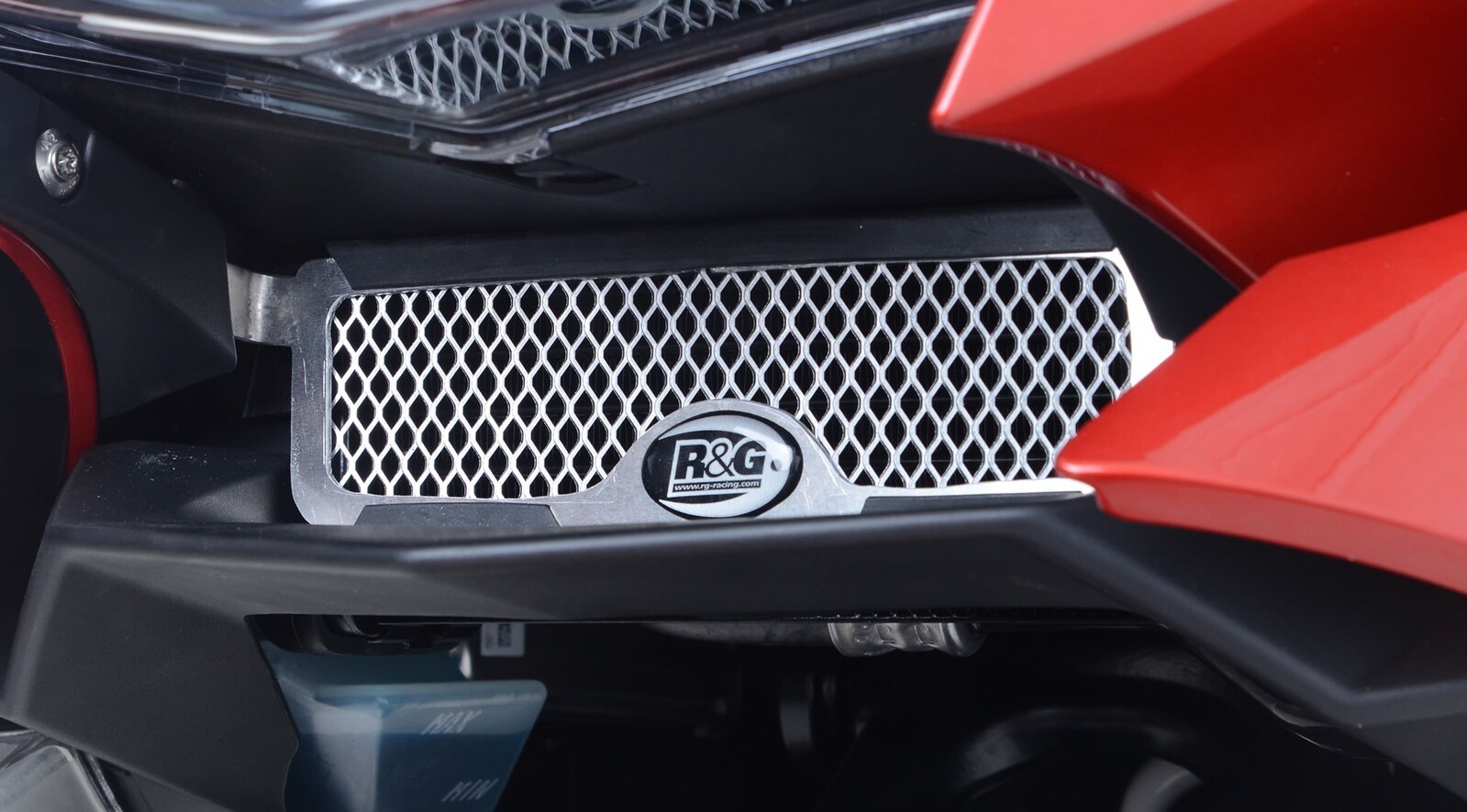 Made from aluminium mesh encased in an aluminium frame, the neat design adds to the looks of the bike as well as keeping the radiator/oil cooler well protected from stones and road debris kicked up by the wheel or by other road users