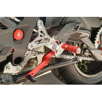 Adjustable rider rearsets made in aluminum machined from billet using CNC machines and subsequent surface anodization.Main features:1) increased sections for points of maximum stress.2) the foldable ‚¬œracing‚¬ footrests, knurled for maximum grip even in the most critical wet conditions, are mounted on eccentric with 12 adjustment positions.3) the aluminum heel guards are designed to guarantee optimal support and protection.4) the gear lever and rear brake pegs are adjustable in three positions.5) the gear lever peg is reclining and lockable by flexible steel pin, included in the kit.As additional part in case of aftermarket exhaust fitting, it is possible to buy the right heel guard kit PES03 Please check Specifications for model compatibility.Delivery note: At Sportsbike, we offer a wide range of high-quality products, many of which are sourced directly from Europe. We have stock both in Australia and shipped in directly from Europe. Therefore, please allow 1-3 weeks for delivery. This ensures we can provide the best selection and service for your specific needs. We will confirm the ETA of shipping within 24-48 hours of an order being placed. Thank you for your understanding and patience!