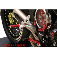 Adjustable rider rearsets made in aluminum machined from billet using CNC machines and subsequent surface anodization.Main features:1) increased sections for points of maximum stress.2) the foldable ‚¬œracing‚¬ footrests, knurled for maximum grip even in the most critical wet conditions, are mounted on eccentric with 12 adjustment positions.3) the aluminum heel guards are designed to guarantee optimal support and protection.4) the gear lever and rear brake pegs are adjustable in three positions.5) the gear lever peg is reclining and lockable by flexible steel pin, included in the kit.As additional part in case of aftermarket exhaust fitting, it is possible to buy the right heel guard kit PES03 Please check Specifications for model compatibility.Delivery note: At Sportsbike, we offer a wide range of high-quality products, many of which are sourced directly from Europe. We have stock both in Australia and shipped in directly from Europe. Therefore, please allow 1-3 weeks for delivery. This ensures we can provide the best selection and service for your specific needs. We will confirm the ETA of shipping within 24-48 hours of an order being placed. Thank you for your understanding and patience!