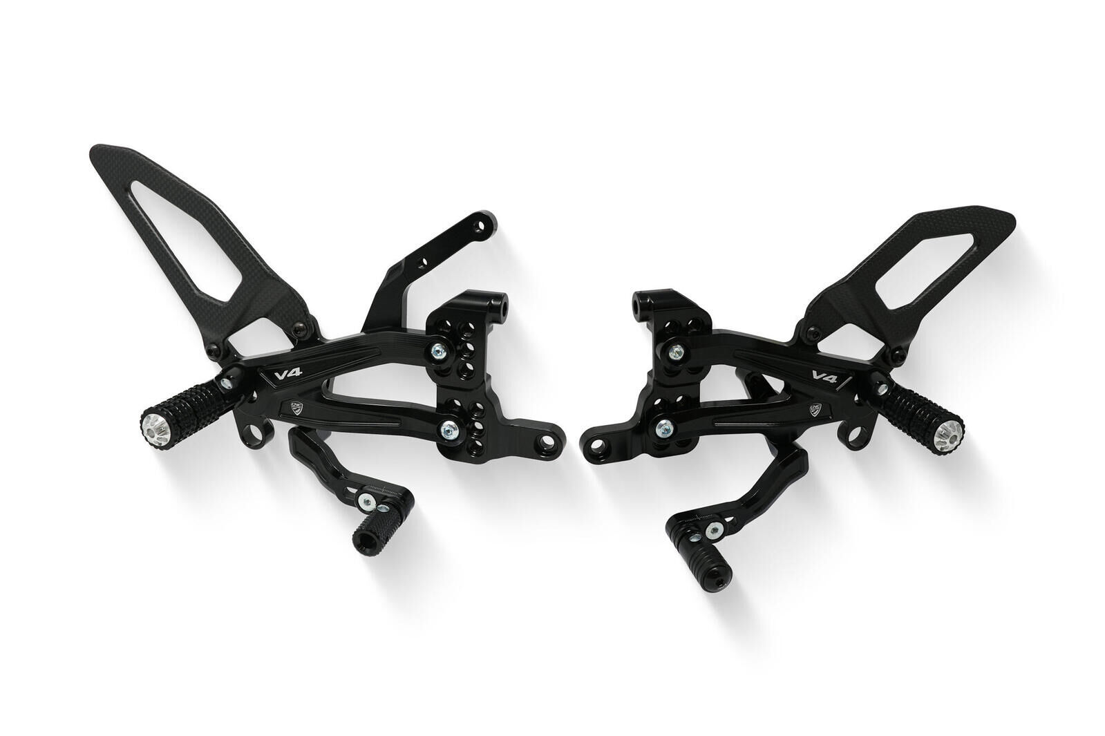 Top quality materials, robustness and specific assembly components for extreme use characterize the new rear sets for Ducati Panigale V4 R.Main features:1) oversized sections for maximum stress on the track race.2) 12 positions3) road and reverse (GP pattern) shifting.4) footpegs have been CNC knurled for maximum grip even in the wettest conditions. 5) support for race bike stand.6) carbon fiber heel guards, developed to provide optimum support and protection.7) footrests and toe pegs are folding and lockable by steel spring pins, included in the kit.8) the gearshift and rear brake levers are mounted on bearings for optimum smoothness.9) pressure brake light switch is included. Please check Specifications for model compatibility.Delivery note: At Sportsbike, we offer a wide range of high-quality products, many of which are sourced directly from Europe. We have stock both in Australia and shipped in directly from Europe. Therefore, please allow 1-3 weeks for delivery. This ensures we can provide the best selection and service for your specific needs. We will confirm the ETA of shipping within 24-48 hours of an order being placed. Thank you for your understanding and patience!