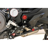 Registered Design nr. 15018362Top quality materials, robustness and specific assembly components for extreme use characterize the new rearsets for Ducati Monster 937.MAIN FEATURES:- Footpegs have been CNC knurled for maximum grip even in the wettest conditions.- Four positioning on the main bracket which together with the two available for the footrest allow 8 combinations.- The gearshift and rear brake levers are mounted on double bearings for optimum smoothness.- The length of the brake and gear levers is adjustable with sliding guide (range of 33 mm.).- Footrests and lever pegs are folding and lockable by steel spring pins, included in the kit.- Road and reverse (GP pattern) shifting: the kit includes the wiring for an easy and reversible inversion of the Ducati QS sensor pulse.- Compatible with the original stop light sensor.- Bracket for rear brake master cylinder and its oil tank.- Exhaust bracket with silent-block. Please check Specifications for model compatibility.Delivery note: At Sportsbike, we offer a wide range of high-quality products, many of which are sourced directly from Europe. We have stock both in Australia and shipped in directly from Europe. Therefore, please allow 1-3 weeks for delivery. This ensures we can provide the best selection and service for your specific needs. We will confirm the ETA of shipping within 24-48 hours of an order being placed. Thank you for your understanding and patience!