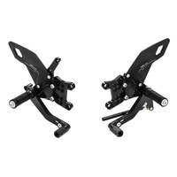 Top quality materials, robustness and specific assembly components for extreme use characterize the new rear sets for Aprilia RSV4 and Tuono.Main features:1) oversized sections for maximum stress on the track race.2) 12 positions3) road and reverse (GP pattern) shifting.4) footpegs have been CNC knurled for maximum grip even in the wettest conditions. 5) support for race bike stand.6) alluminium heel guards, developed to provide optimum support and protection.7) fixed footrests and toe pegs.8) the gearshift and rear brake levers are mounted on bearings for optimum smoothness.9) pressure brake light switch is included. Please check Specifications for model compatibility.Delivery note: At Sportsbike, we offer a wide range of high-quality products, many of which are sourced directly from Europe. We have stock both in Australia and shipped in directly from Europe. Therefore, please allow 1-3 weeks for delivery. This ensures we can provide the best selection and service for your specific needs. We will confirm the ETA of shipping within 24-48 hours of an order being placed. Thank you for your understanding and patience!