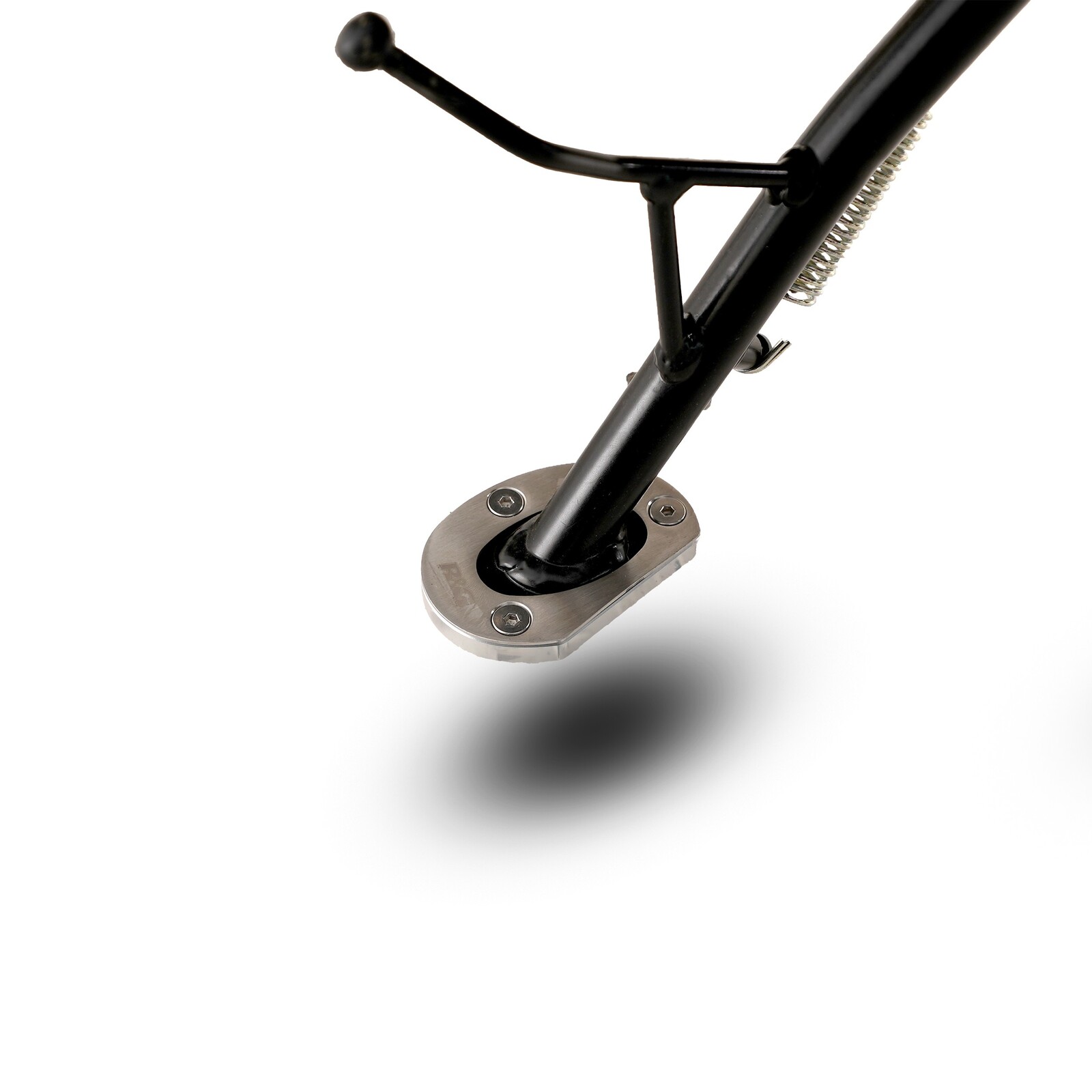 Kickstand shoes bolt onto the bottom of the sidestand, to enlarge the original’s footprint by up to 100%, significantly spreading the load placed upon it, to help prevent the stand ‘piercing’ the ground.
