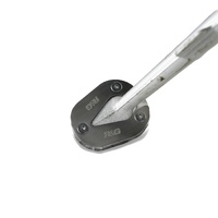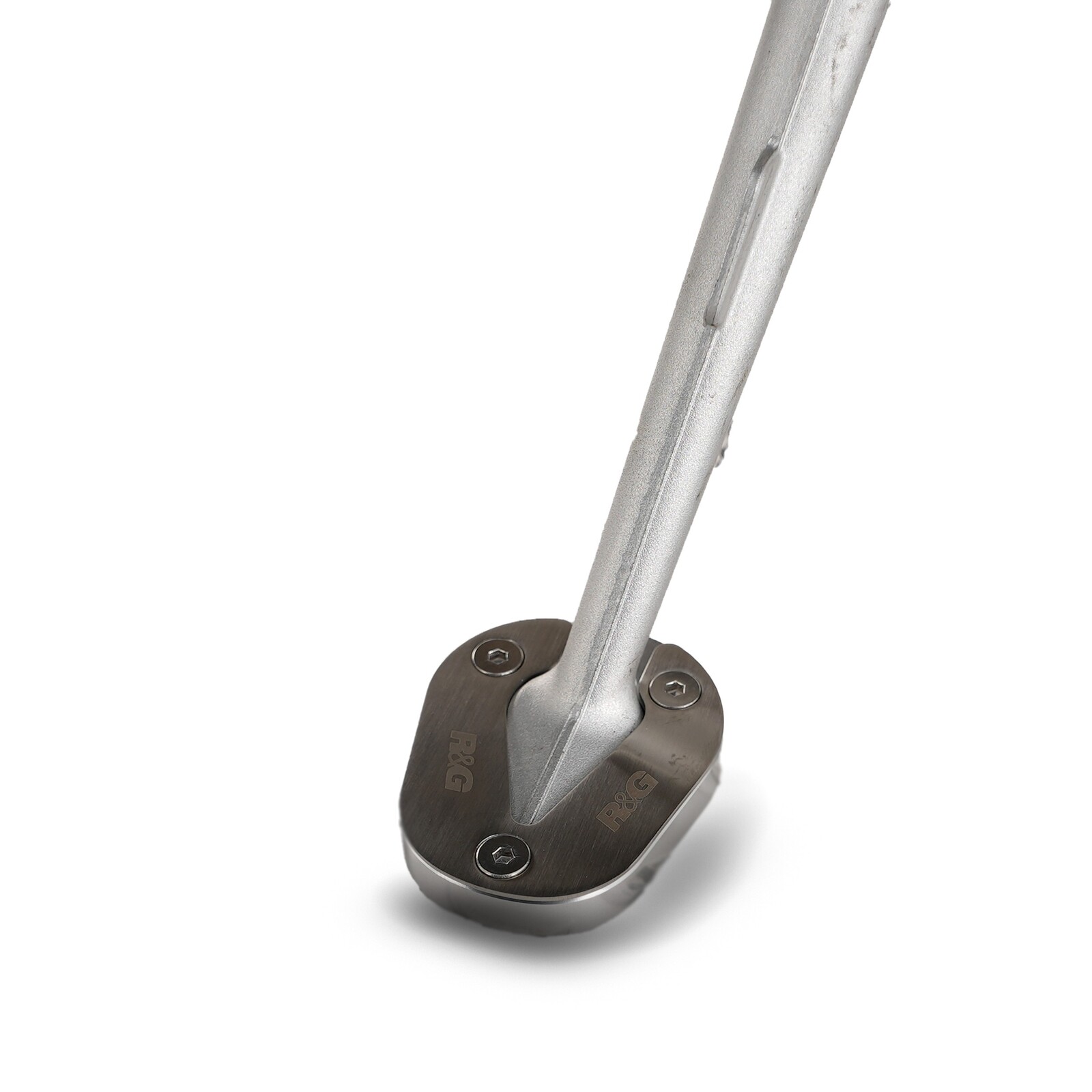 Kickstand shoes bolt onto the bottom of the sidestand, to enlarge the original’s footprint by up to 100%, significantly spreading the load placed upon it, to help prevent the stand ‘piercing’ the ground.