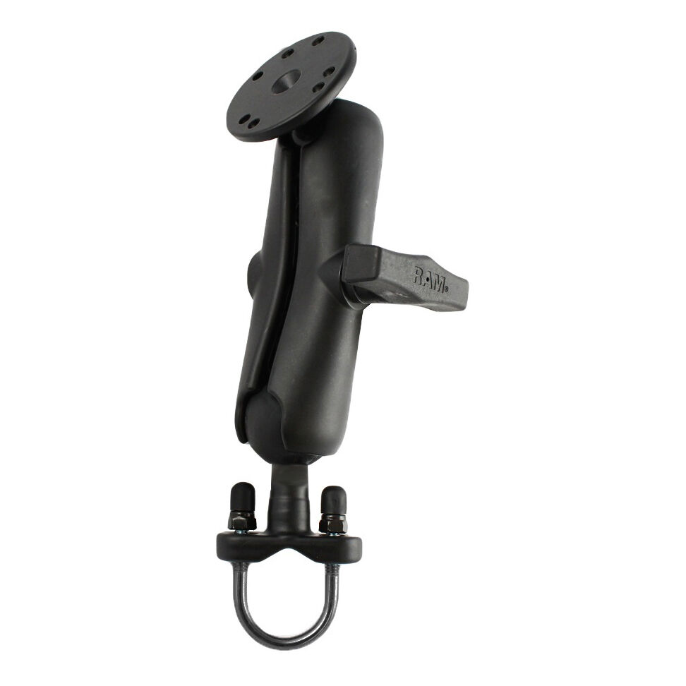 The RAM-101U-IP1 consists of a zinc coated u-bolt base, double socket, arm and 2.5" diameter round base that contains the universal AMPs hole pattern. Included in this package is hardware that will accommodate rails from 0.50" to 1.25" in diameter. The base includes black cover caps to be placed over the exposed ends of the u-bolt. The included composite rail adapter can narrow the rail to a minimum width of 0.5". The mount is designed with a RAM 1.5" diameter patented rubber ball and socket system that has adjustment points at both ends of the double socket arm; this allows for almost infinite adjustment and perfect viewing angles.