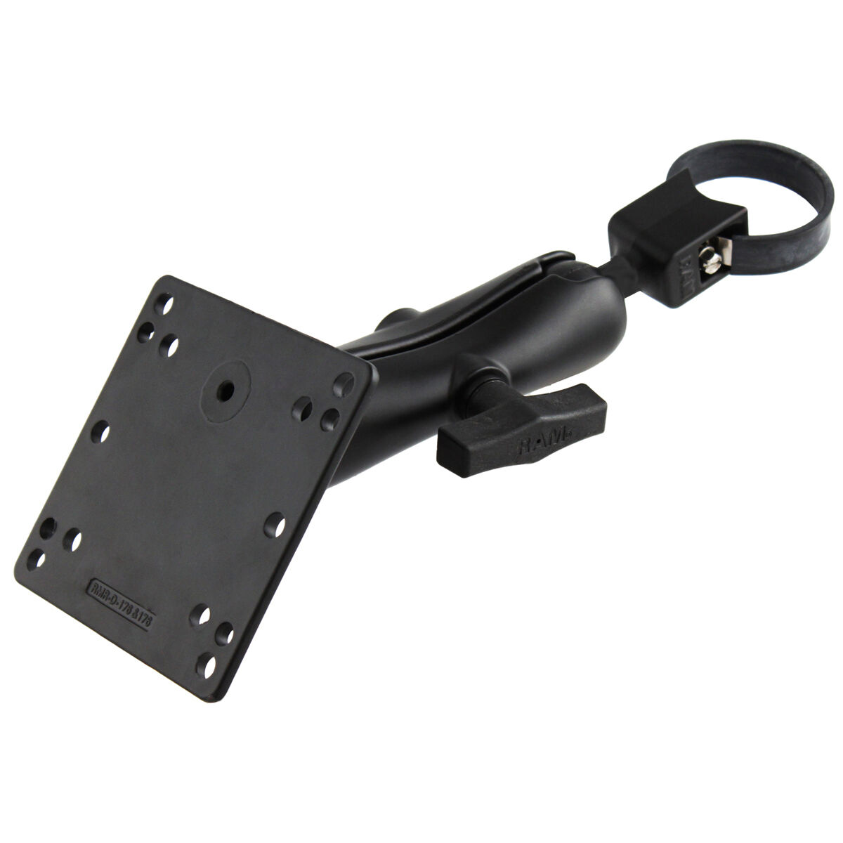 The RAM-108B-246U consists of a strap clamp 1.5" diameter ball base, standard length double socket arm and VESA (4 X 75mm) (4 X 100mm) plate. The strap will accommodate rails from 1" to 2.1" in diameter. Included is a rubber protection strip to help reduce vibration and to prevent scratching of the mounting surface. The 4.75" square plate contains 4x100mm holes and 4x75mm holes in each corner.