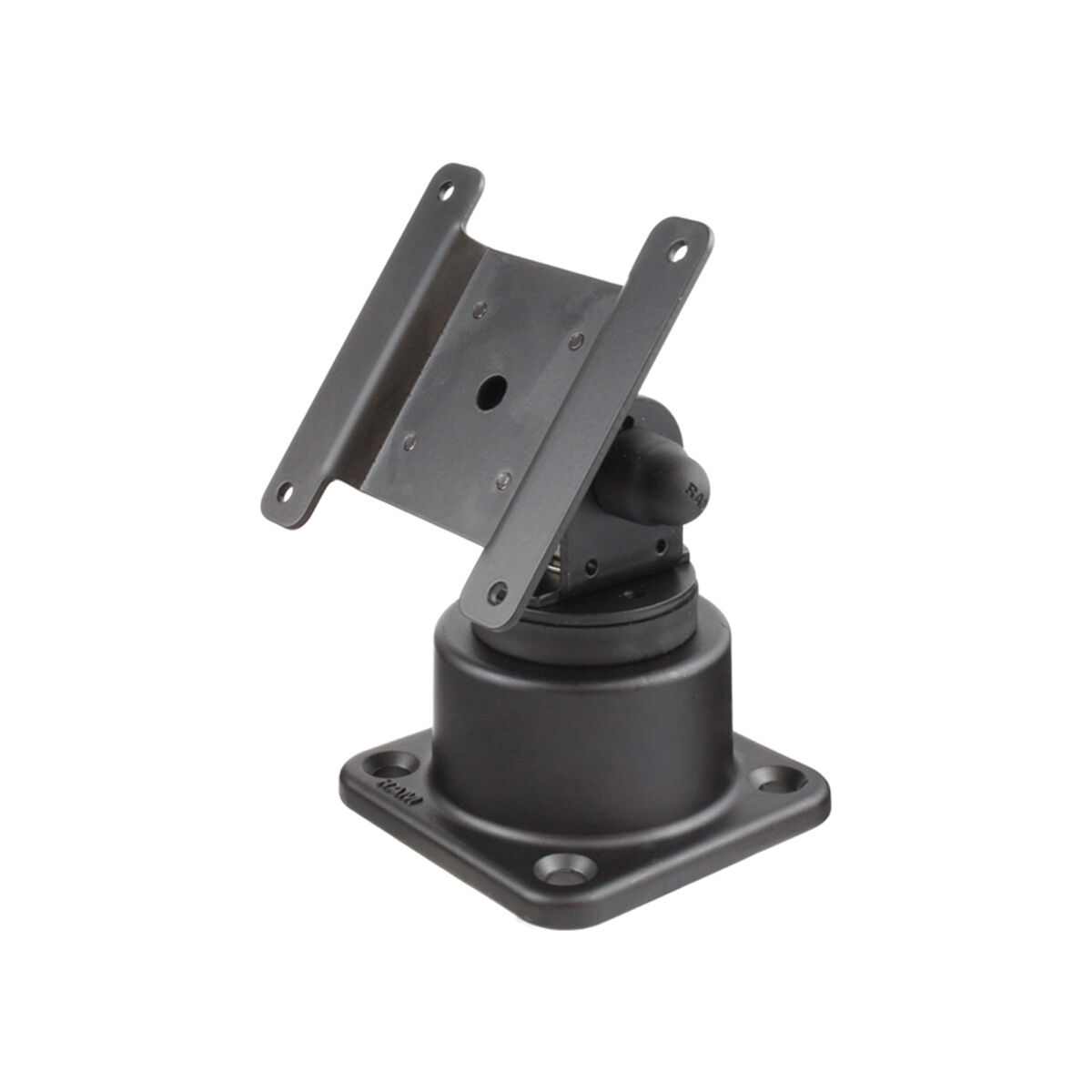 The RAM Horizontal Swivel Pivot Mount consists of a horizontal mounting base that connects to an adapter plate that rotates 360 degrees and can tilt forward and back.