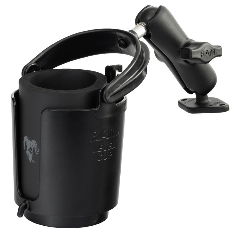 A favorite world wide, the RAM Level Cup Self-Leveling Drink Holder will bring a smile to anyones face when they get it. The perfect accessory for any vehicle including motorcycles, ATVs, Big Rigs, and yes, even your prized riding lawn mower. Easily installed and positions to keep your favorite beverage within reach, this gem even comes with a RAM can insulator. Take a corner as hard as you like, this holder is ready to ride. Included is a koozie, self leveling drink cup, double socket arm and diamond plate that contains the industry standard AMPS hole pattern. Designed into the mount is a 1" diameter patented rubber ball and socket system with an adjustment point at the diamond plate and base of the cup holder. Compatible with any cups, cans, bottles or mugs ranging from 2.5 to 3.5 diameter.