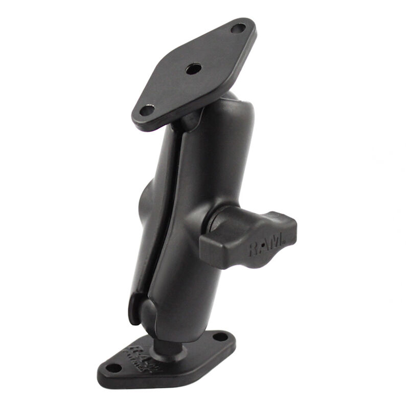 The RAM-B-102U consists of a double socket arm and two diamond bases. The diamond bases measure 2.43" x 1.31" diamond base and contain two holes 1.912" from center to center, positioned at both ends of the diamond base. The hole pattern found on the diamond bases will connect to many RAM cradles, as well as third party cradles including mounts with the industry standard AMPS hole pattern. Designed into the mount is a 1" diameter patented rubber ball and socket system with adjustment points at both socket ends of the arm.