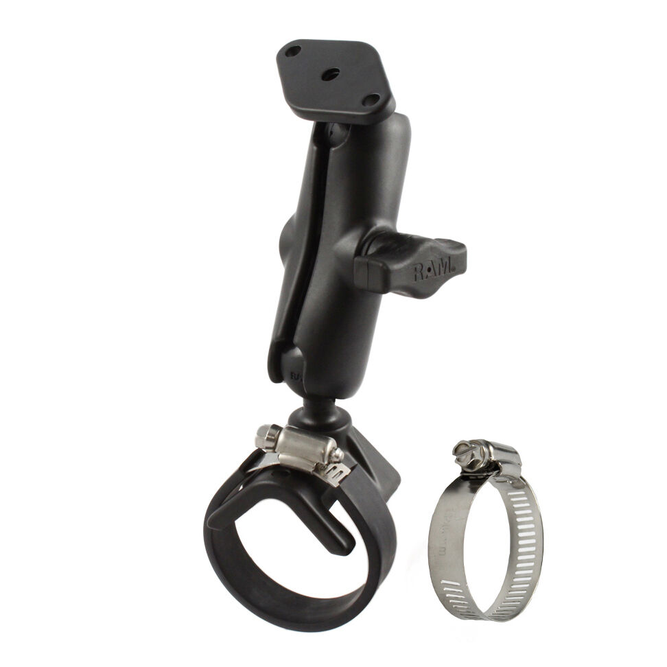 The RAM-B-108U-GP1 consists of a medium length B-size arm with a 2.41" x 1.31" diamond plate with 2 hole AMPS pattern on one end and a strap clamp base for rails between 1" and 2.1" in diameter on the other.