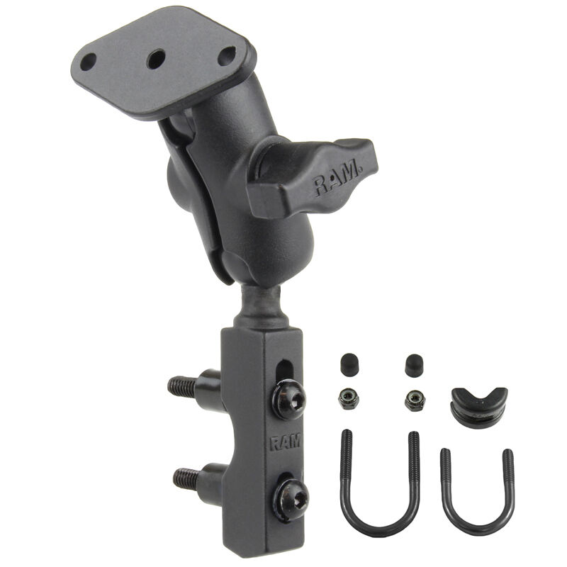 The RAM-B-174U-A consists of hardware for mounting to either brake/clutch reservoirs and rails that are 0.5" to 1.25" in diameter, short length double socket arm and diamond plate for mounting to RAM device cradles or anything with an AMPs hole pattern. The mounting hardware for brake/clutch reservoirs include both standard and metric mounting bolts. Designed into the mount is a 1" diameter patented rubber ball and socket system with adjustment points at both ends of the socket arm; this with a twist of the arm knob allows you to move the mount to your optimum viewing position.