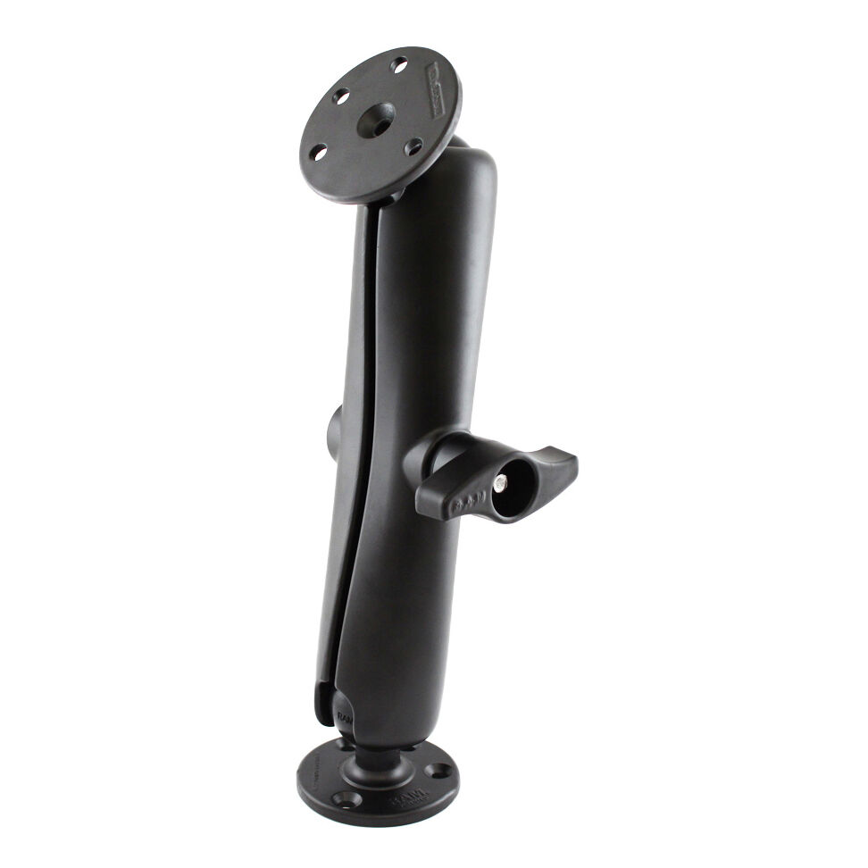 The RAM-D-101U consists of (2 qty) 3.68" diameter round bases and LONG length double socket arm. The 3.68" diameter round bases have pre-drilled holes, including two holes at 180 degrees and three holes at 120 degrees. Designed into the mount is a 2.25" diameter patented rubber ball and socket system with adjustment points at both socket ends of the arm.