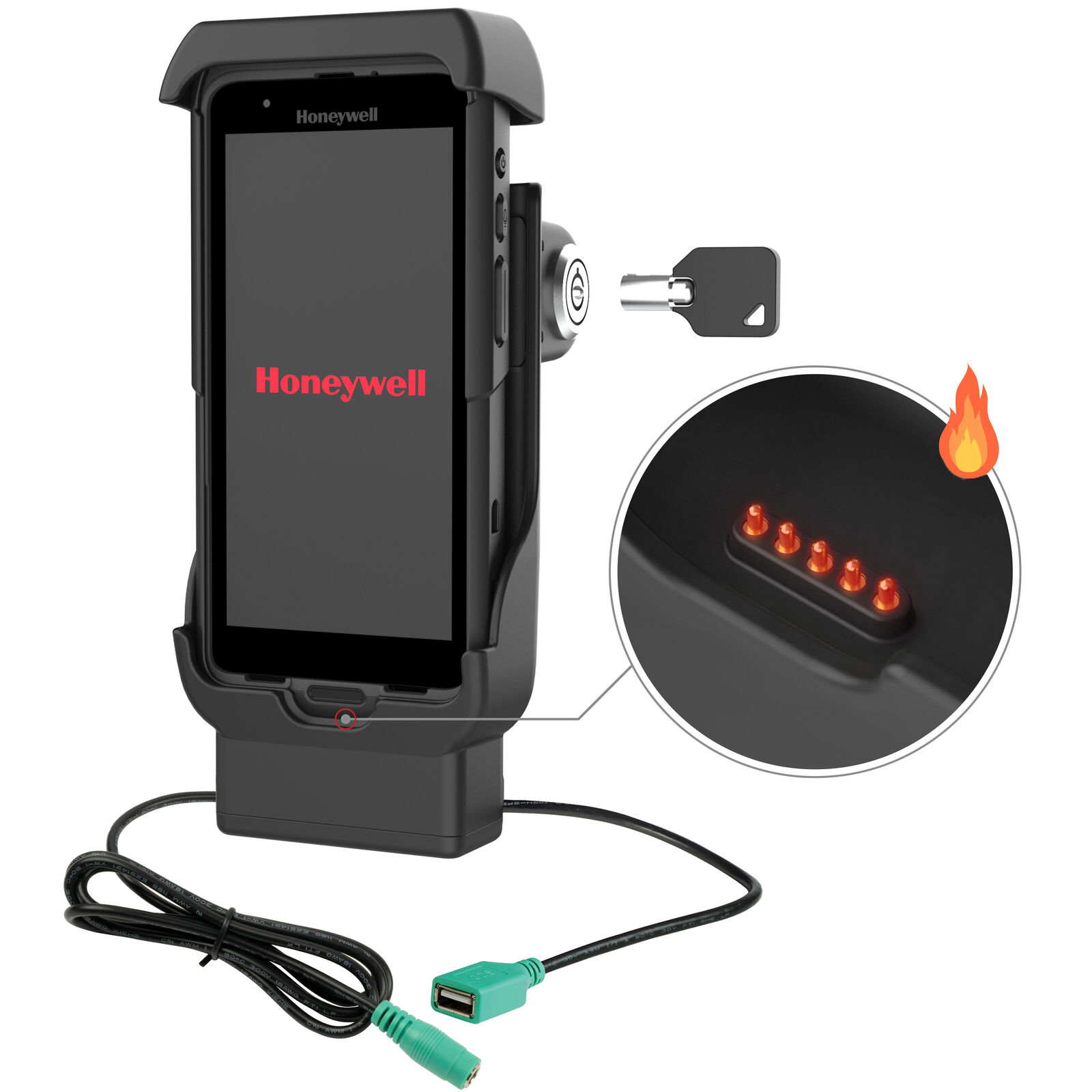 The RAM Powered Dock + USB-A for Honeywell CT40/45/47 - Heated Pins (RAM-HOL-HON12PDHU) is a spring-loaded, form-fit powered dock that allows workers to secure and charge their Honeywell device. Power to the device is delivered via a 1m long female 5.5mm DC barrel connector and supports a single peripheral device via USB-A female connector. This dock includes an integrated stylus holder that snaps your stylus into place while not in use and is designed to accommodate OEM accessories, such as the hand strap. The top cup of the holder features a cut-out, so workers can utilize the device's scanner while docked. This holder comes with optional inserts to support devices with or without the protective rubber boot. The key lock provides theft deterrence and extra security for peace of mind. Combat harsh, freezing environments with heated pogo pins integrated into the dock to ensure a secure connection and prevent the pins from locking up due to ice. Complete your solution by adding a compatible RAM two-hole AMPS pattern diamond base and double ball mount, allowing for a wide variety of mounting options (hardware included).