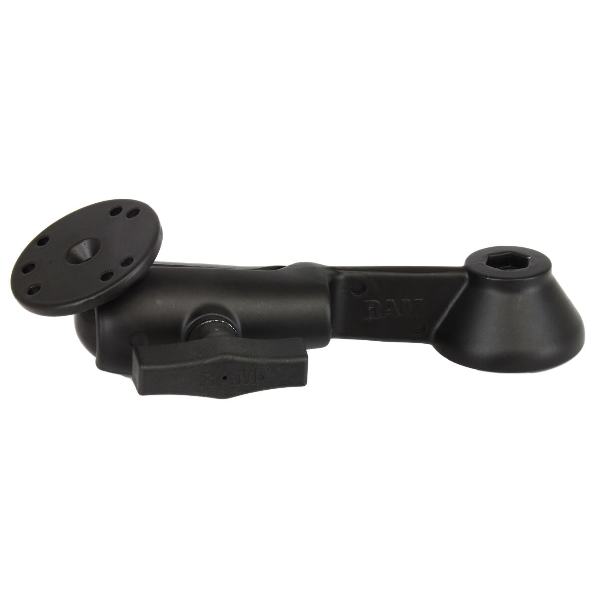 The RAM-VB-109-5U consists of a 6" long single swing arm and 2.5" round base that contains the universal AMPs hole pattern.