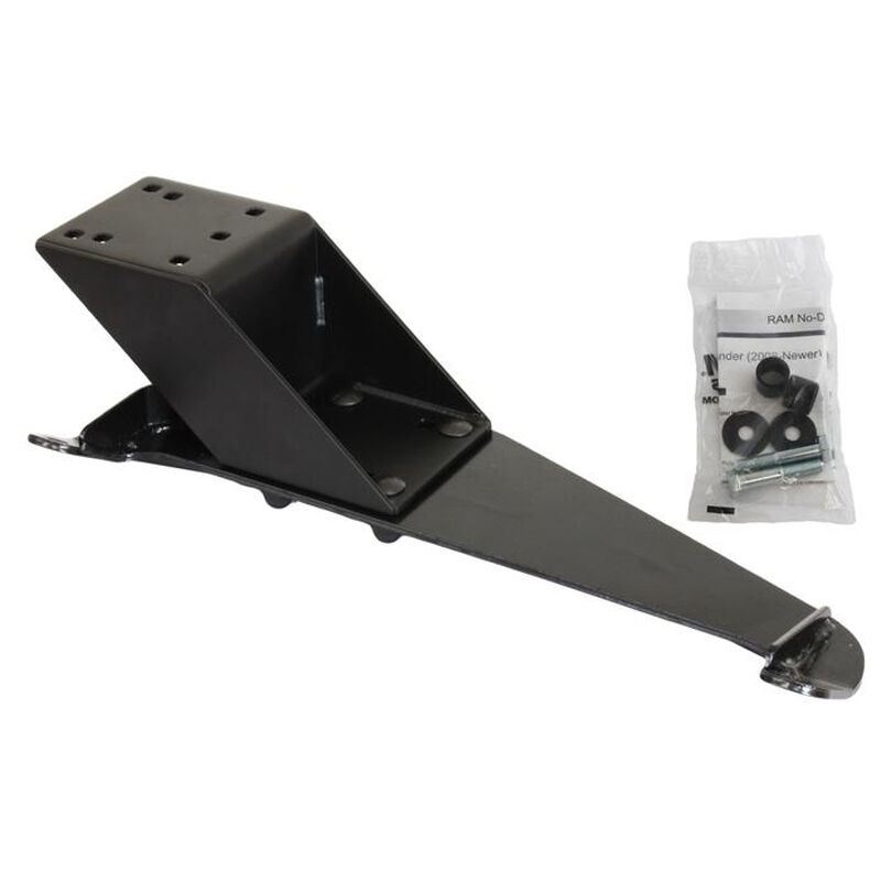 The RAM No-Drill laptop mounting base features a heavy-duty steel mounting base custom designed to fit this vehicle perfectly. Using the passenger side seat rail bolts as attachment points, existing hardware is used to secure the laptop mount base in the vehicle.