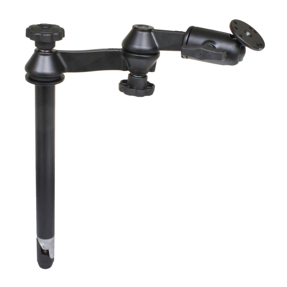 The RAM-VP-SW1-12 consists of a 12" upper male Tele-Pole, double swing arm and 2.5" round base that contains the universal AMPs hole pattern. The Tele-Pole can be easily adjusted by turning the knob at the top of the post. Once the knob has been tightened, the Tele-Pole becomes a rigid support for connecting devices or cradles. The Tele-Pole will connect to any RAM vehicle base with a welded female Tele-Pole. The double swing arm with rotating plate, allows you to twist and tilt the viewing angle of your connected electronic device, when mounted on your RAM Vehicle Mount. The rotating swivel arm gives you even more viewing positions for your mounted electronic device while holding everything firmly in place. The length of the double swing arm is 12".