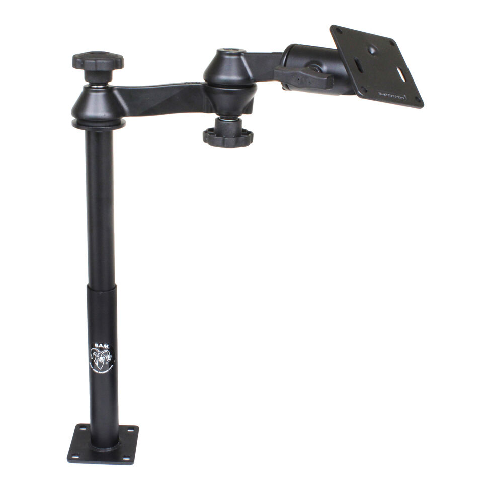 The RAM-VP-SW1-129-2461 consists of a 9" lower female Tele-Pole, 12" upper male Tele-Pole, double swing arm and 3.625" square base that contains the VESA hole pattern. The lower female Tele-Pole will attach to all RAM vehicles bases that do not contain a welded female Tele-Pole. The height of the Tele-Poles, combined, can easily be adjusted by turning the knob at the top of the post. Once the knob has been tightened, the Tele-Pole becomes a rigid support for connecting devices or cradles. The double swing arm allows you to twist and tilt the viewing angle of your connected electronic device, when mounted on your RAM Vehicle Mount. The rotating swivel arm gives you even more viewing positions for your mounted electronic device while holding everything firmly in place. The length of the double swing arm is 12". The 3.625" square base includes a 75mm X 75mm VESA hole pattern with 1.5" rubber ball positioned 0.88" from the center of one edge.