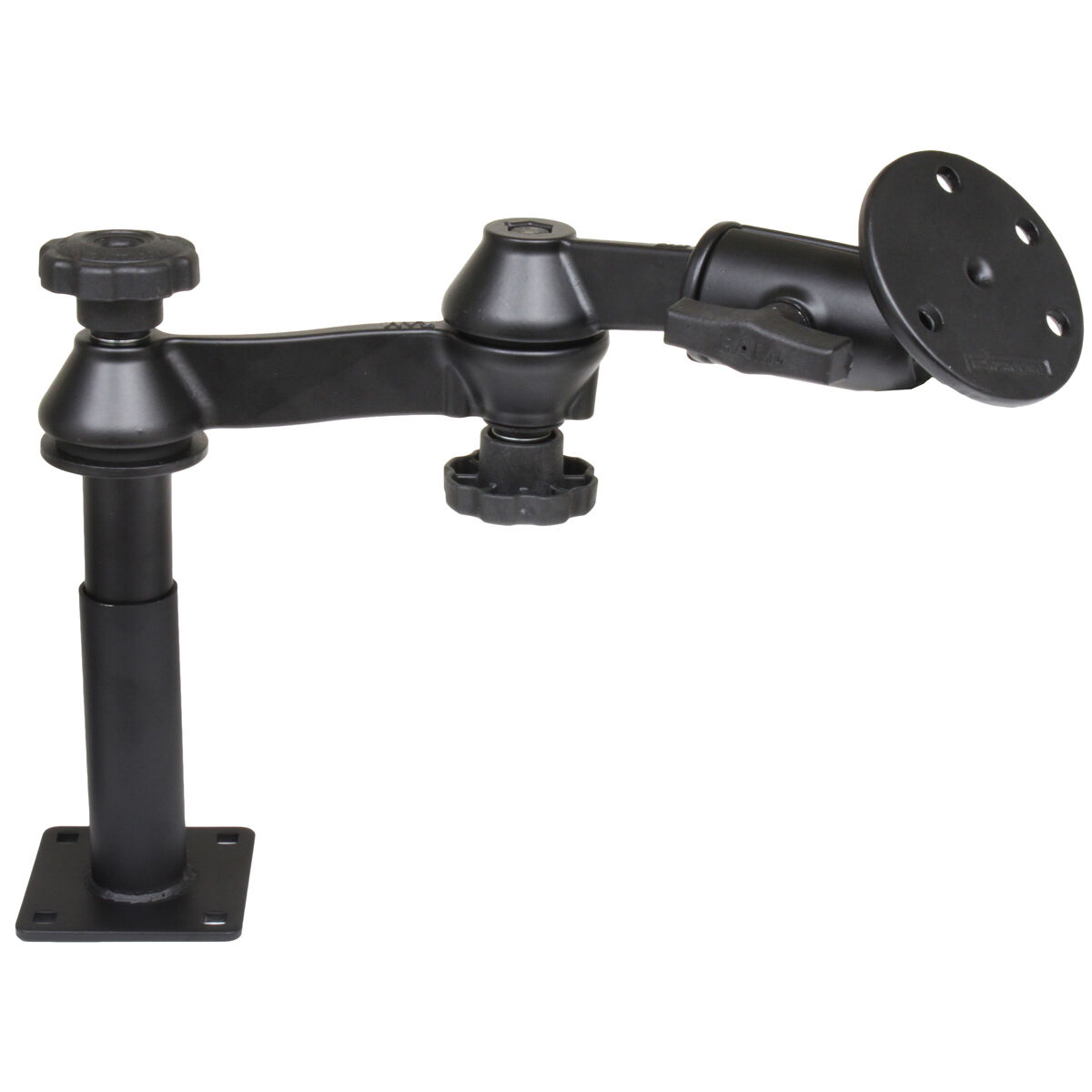 The RAM-VP-SW1-45-240 consists of a 5" lower female Tele-Pole, 4" upper male Tele-Pole, double swing arm and 3.68" round base. The lower female Tele-Pole will attach to all RAM vehicles bases that do not contain a welded female Tele-Pole. The height of the Tele-Poles, combined, can easily be adjusted by turning the knob at the top of the post. Once the knob has been tightened, the Tele-Pole becomes a rigid support for connecting devices or cradles. The double swing arm allows you to twist and tilt the viewing angle of your connected electronic device, when mounted on your RAM Vehicle Mount. The rotating swivel arm gives you even more viewing positions for your mounted electronic device while holding everything firmly in place. The length of the double swing arm is 12". The 3.68" round base contains pre-drilled holes that connects to RAM Tough-Dock Powered Docking Stations.