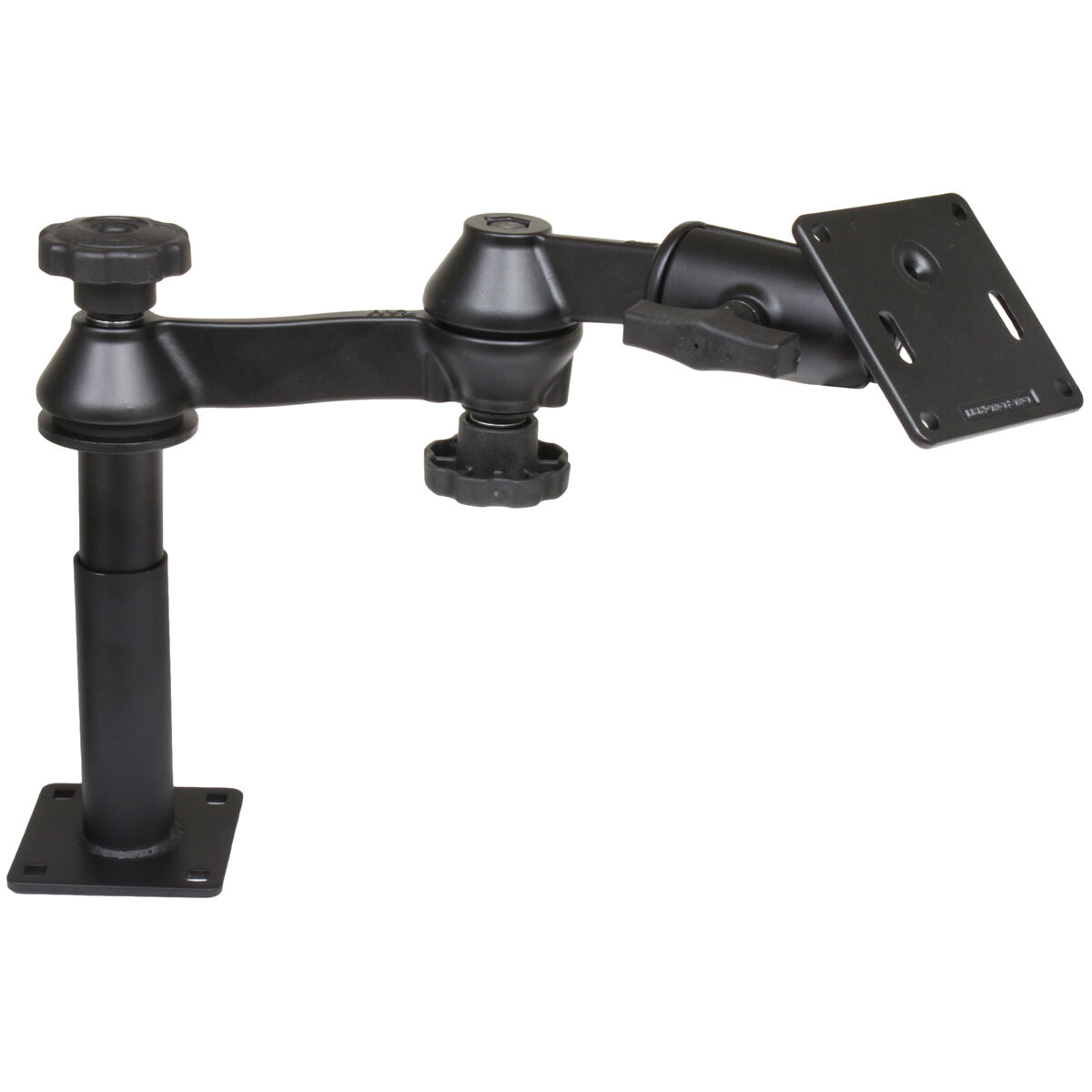 The RAM-VP-SW1-45-2461 consists of a 5" lower female Tele-Pole, 4" upper male Tele-Pole, double swing arm and 3.625" square base that contains the VESA hole pattern. The lower female Tele-Pole will attach to all RAM vehicles bases that do not contain a welded female Tele-Pole. The height of the Tele-Poles, combined, can easily be adjusted by turning the knob at the top of the post. Once the knob has been tightened, the Tele-Pole becomes a rigid support for connecting devices or cradles. The double swing arm allows you to twist and tilt the viewing angle of your connected electronic device, when mounted on your RAM Vehicle Mount. The rotating swivel arm gives you even more viewing positions for your mounted electronic device while holding everything firmly in place. The length of the double swing arm is 12". The 3.625" square base includes a 75mm X 75mm VESA hole pattern with 1.5" rubber ball positioned 0.88" from the center of one edge.