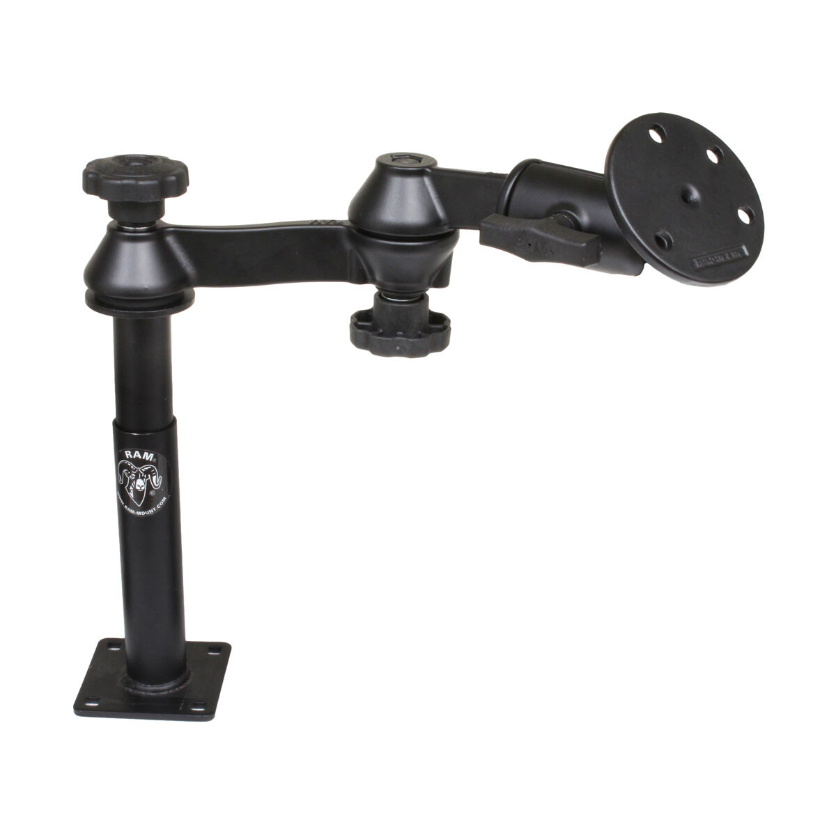 The RAM-VP-SW1-47-240 consists of a 7" lower female Tele-Pole, 4" upper male Tele-Pole, double swing arm and 3.68" round base. The lower female Tele-Pole will attach to all RAM vehicles bases that do not contain a welded female Tele-Pole. The height of the Tele-Poles, combined, can easily be adjusted by turning the knob at the top of the post. Once the knob has been tightened, the Tele-Pole becomes a rigid support for connecting devices or cradles. The double swing arm allows you to twist and tilt the viewing angle of your connected electronic device, when mounted on your RAM Vehicle Mount. The rotating swivel arm gives you even more viewing positions for your mounted electronic device while holding everything firmly in place. The length of the double swing arm is 12". The 3.68" round base contains pre-drilled holes that connects to RAM Tough-Dock Powered Docking Stations.