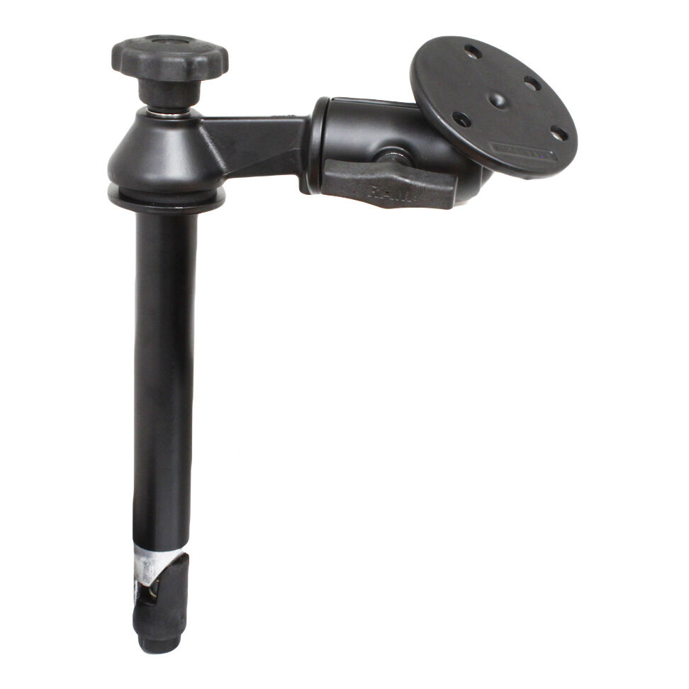 The RAM-VP-SW2-8-240 consists of a 8" upper male Tele-Pole, single swing arm and 3.68" round base. The Tele-Pole can be easily adjusted by turning the knob at the top of the post. Once the knob has been tightened, the Tele-Pole becomes a rigid support for connecting devices or cradles. The Tele-Pole will connect to any RAM vehicle base with a welded female Tele-Pole. The length of the double swing arm is 6". The 3.68" round base contains pre-drilled holes that connects to RAM Tough-Dock Powered Docking Stations.