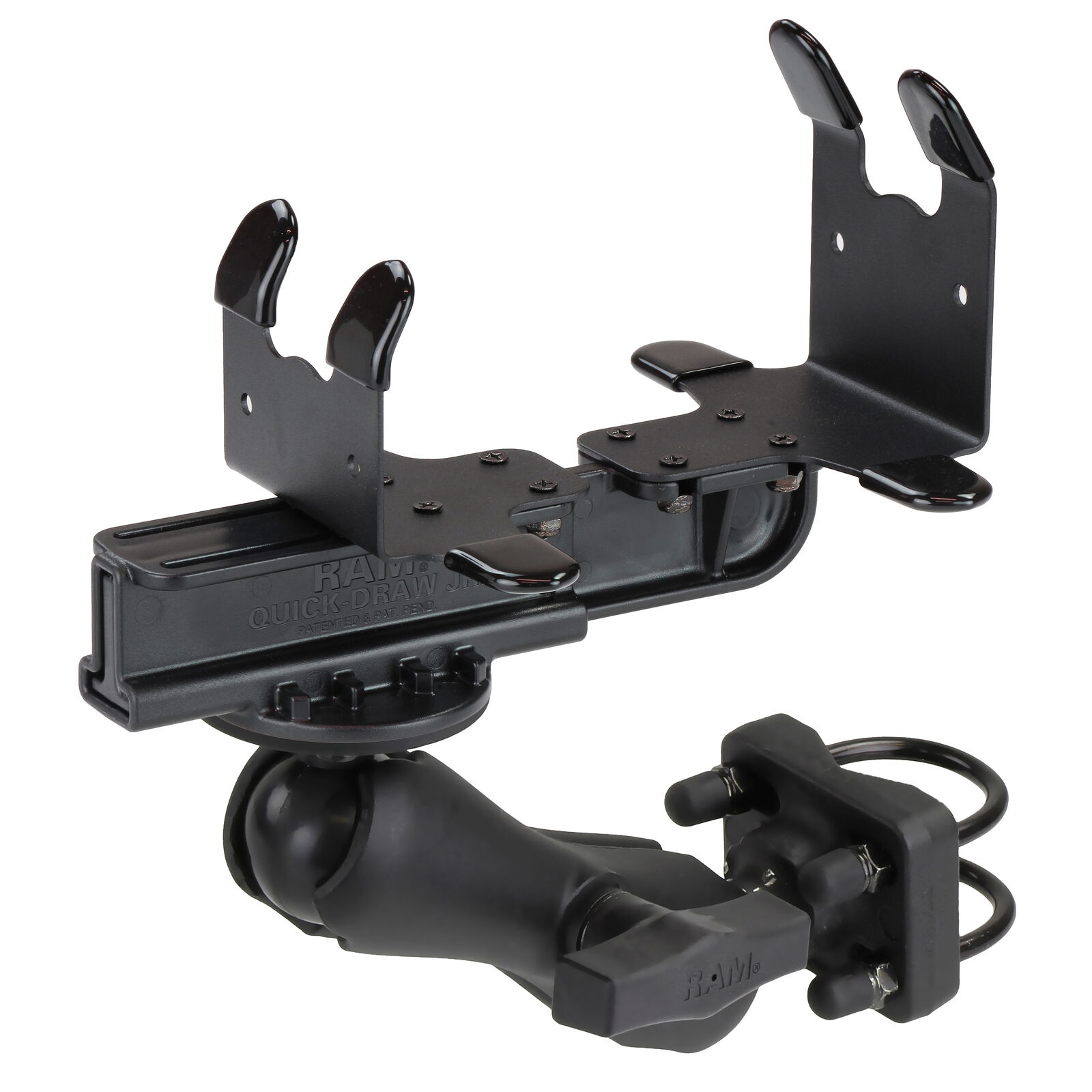 The RAM-VPR-107-1 uses a unique spring loaded mechanism that holds strong, yet provides easy removal for printer storage. At each end of the spring loaded cradle are small side clamp plates that are designed to fit cleanly around either edge of the printer. Included is a standard length arm and round pipe base, which will connect to any RAM Tele-Pole and other poles with a diameter from 1.25" to 1.5".