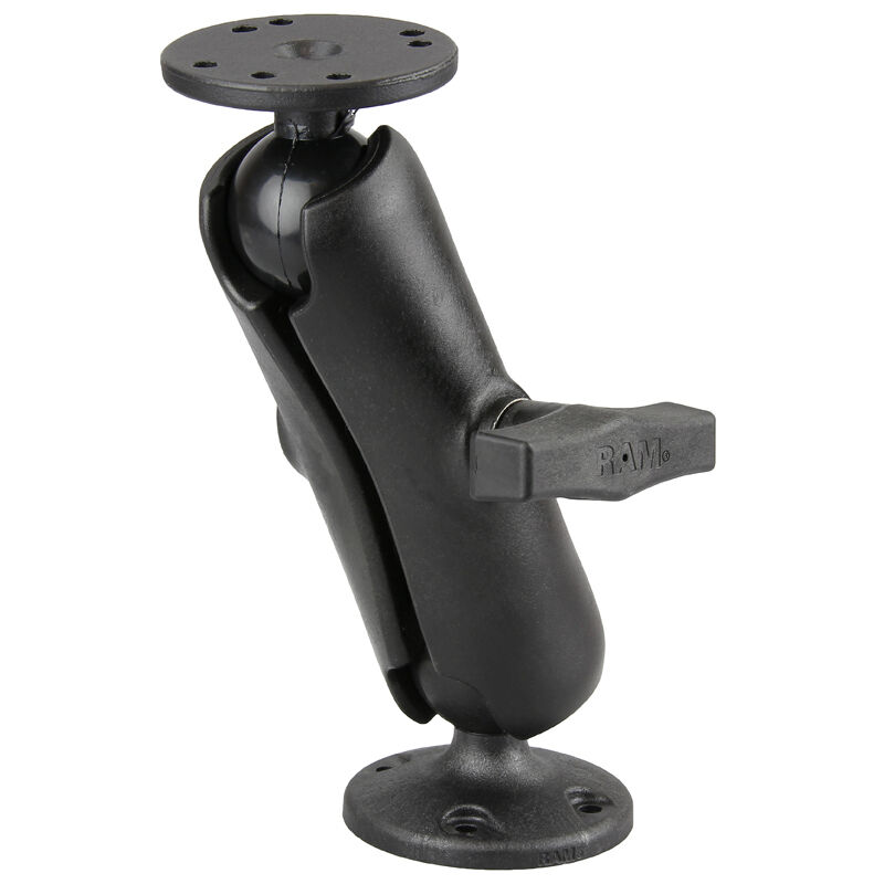 The RAP-101U-G4 consists of a 2.5" diameter round base with the universal AMPS hole pattern, double socket arm and round adapter base that attaches directly to the back of the Garmin echo. Designed into the mount is a 1.5" diameter patented rubber ball and socket system with adjustment points at both socket ends of the arm; this with RAM's rubber ball and socket technology allows for almost infinite adjustment and perfect viewing angles. Included is hardware that is used to attach the Garmin echo to the RAM Mount.