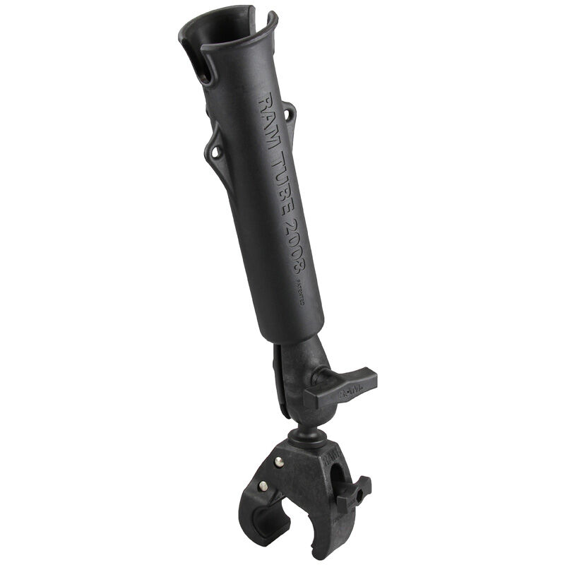 The RAP-119-404U consists of the RAM-TUBE 2008 fishing rod holder and Tough-Claw for quick and easy tool-less installation and removal on round, square, odd shaped rails and bars. The Tough-Claw can be clamped on rails from 1" to 1.6" outer diameter. Offering the unique RAM rubber ball and socket feature, you can rotate the holder 360 degrees while tilting forward and back for the optimal angle. The RAM-TUBE 2008 allows you to easily insert your fishing rod, umbrella or flashlight for convenient access. Ideally suited for anything from Kayaks to the OtterBox Venture Cooler.