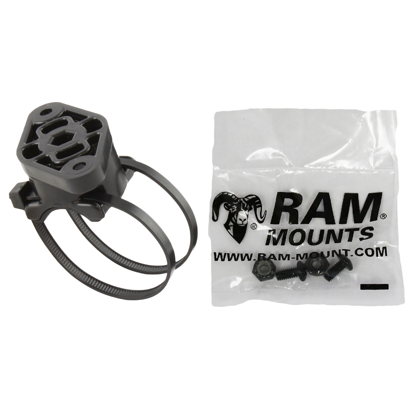The RAP-274-1HU consists of the EZ-ON/OFF dual strap base and swivel diamond adapter base. Adjust the zip ties to attach to a variety of rails, from a minimum of 0.5" in diameter. With a press on the diamond adapter the EZ-ON/OFF system allows for the quick release of the diamond adapter from the base. When connected, the diamond base can rotate to your optimum viewing position. The hole pattern found on the diamond adapter will connect to a large variety of RAM Mount and third party cradles and mounts, including those with the industry standard AMPS hole pattern. Included is hardware that will attach all RAM cradles, with an AMPS 2-Hole diamond hole pattern, to the RAP-274-1HU.