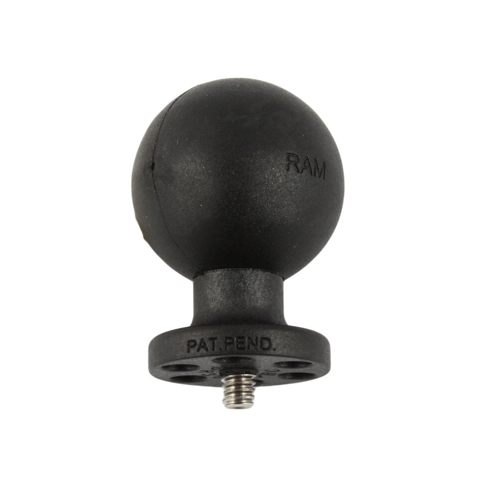 The RAP-366U, universal camera and camcorder base, consists of a 1.5" diameter rubber ball, connected to a round plate with 1/4"-20 camera thread. The round plate provides extra support and stability for cameras that rest on top of it. The male 1/4"-20 threaded steel stud will connect to any standard female thread found on camcorders and digital cameras.