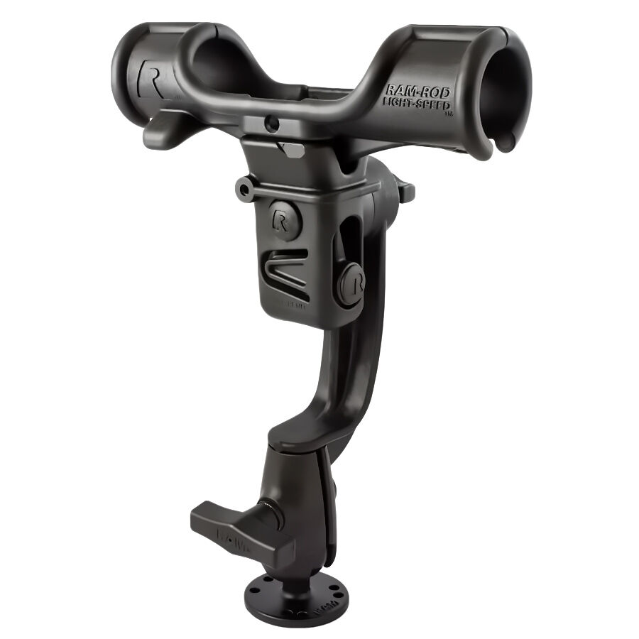 The RAP-370-RBSWU consists of the RAM ROD Light-Speed fishing rod holder, RAM ROD Revolution ratchet arm with single open socket and stainless steel 2.5" diameter round base that contains the universal AMPS hole pattern. Offering the patented RAM rubber ball, socket and ratcheting feature, you can rotate the rod holder 360 degrees, while tilting the rod holder forward and back for the optimum fishing angle. . The RAM ROD Light-Speed is another innovative product in RAMs long list of high quality, industry leading fishing products. Ideally suited for spinning reels and bait casting reels, the Light-Speed rod holder provides smooth action when inserting and removing the fishing rod, yet holds firm in rough water or while trolling. The spring loaded design enables rapid removal of the rod and reel when a fish is on, and offers easy placement of the rod in the rod holder.