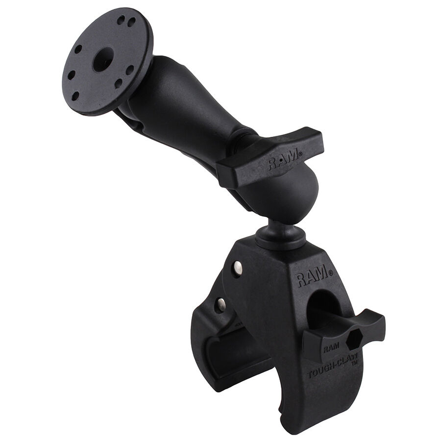 The RAP-401-202U consists of the large Tough-Claw base, double socket arm and round base adapter. The RAM Tough-Claw is the perfect mounting base for quick and easy tool-less installation and removal on round, square, odd shaped rails and bars. The Tough-Claw can be clamped on rails from 1" - 2.2" outer diameter. The round base adapter contains the industry standard universal AMPS hole pattern, which will connect to a large variety of RAM Mount and third party cradles. The mount is designed with a RAM 1.5" diameter patented rubber ball and socket system that has adjustment points at both ends of the double socket arm; this allowing for almost infinite adjustment and perfect viewing angles.