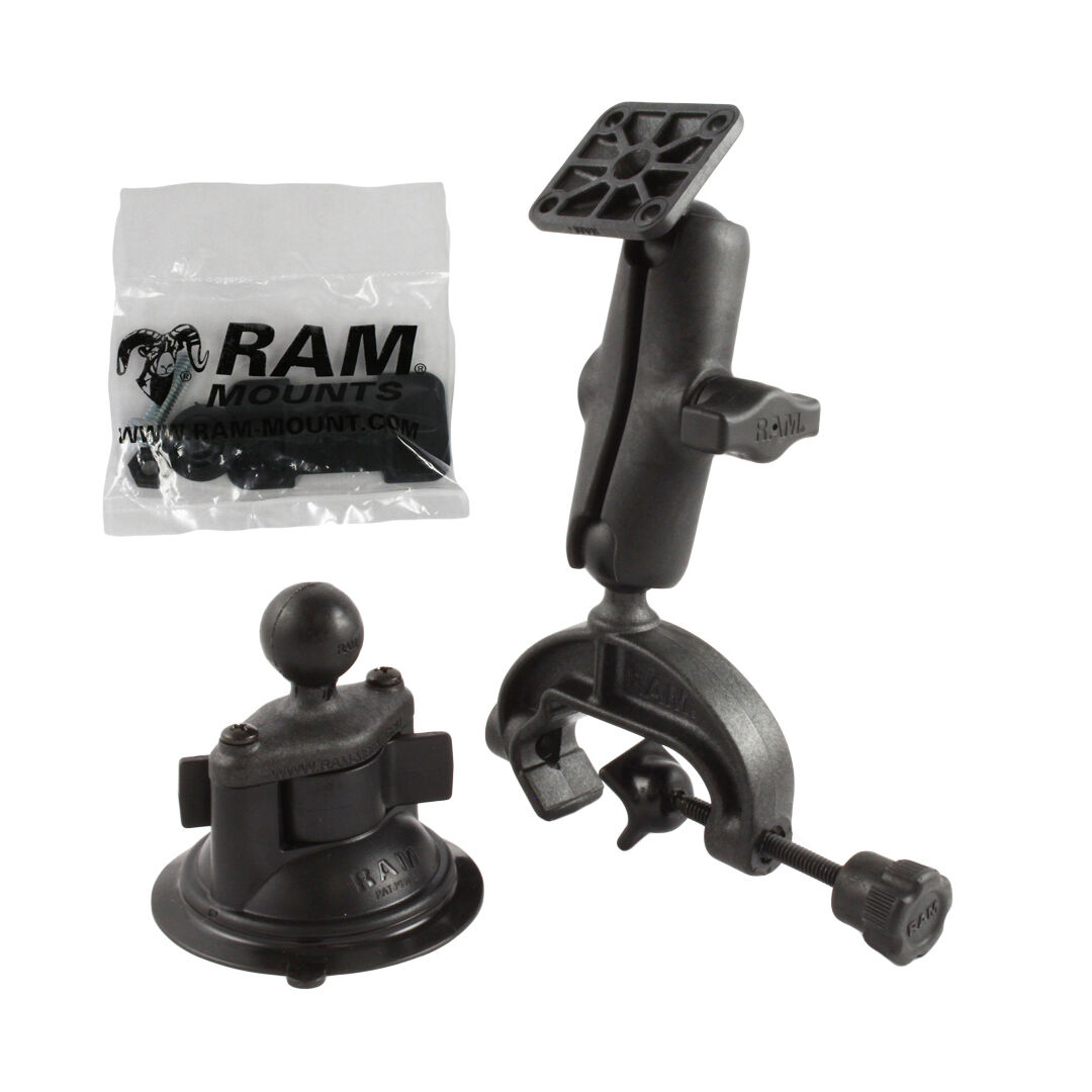 The RAP-B-121-224-1U consists of a yoke clamp base, 3.3" diameter suction cup base, standard length double socket arm and 2" x 1.7" square base that contains the universal AMPs hole pattern. The yoke clamp base will fit rails in diameter from 0.625" to a maximum of 1.25". The 1" rubber ball is at a right angle to the plane of the mount; when connected to a rail, the ball sits parallel to the rail. The suction cup is designed to have an extra strong hold on any smooth non-porous surface, but for best result, mount the suction cup on a glass or non-porous plastic surface.