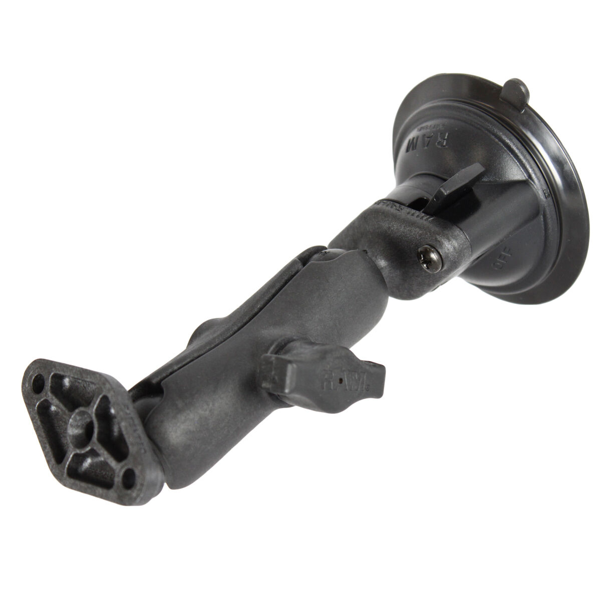 The RAP-B-166U consists of a 3.3" diameter suction cup twist lock base, STANDARD length double socket arm and diamond base adapter. The suction cup base is designed to have a strong hold on glass and non-porous plastic surfaces, including RAM adhesive disks. The mount is designed with a RAM 1" diameter patented rubber ball and socket system that has adjustment points at both ends of the double socket arm; this allowing for almost infinite adjustment and perfect viewing angles. The hole pattern found on the diamond base adapter will connect to most RAM cradles.