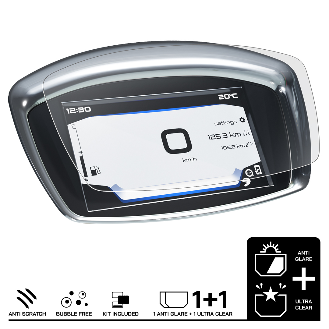 - Anti-Glare: Offers the same scratch resistance as Ultra-Clear but reduces glare and reflections from LCD/TFT dashboards. Anti-glare protectors have a subtle matte appearance once fitted. (If anti-glare is not listed for your model, it is currently unavailable.)