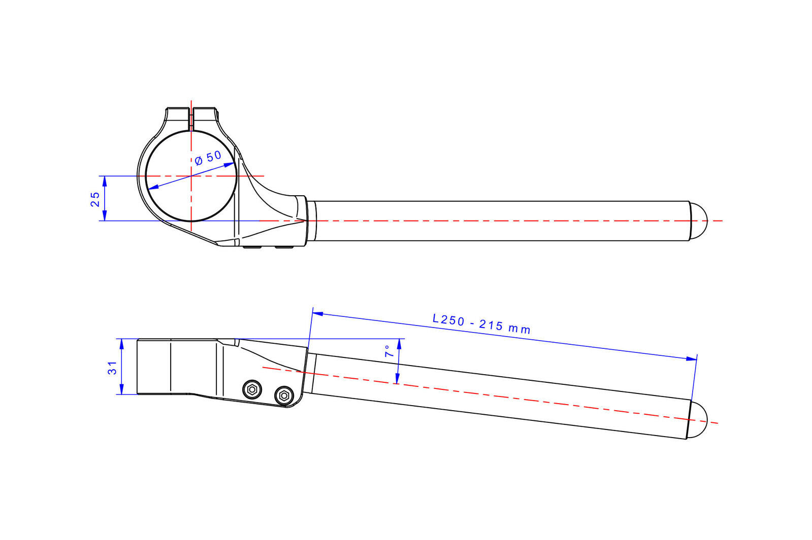 Clip-ons made in light alloy, machined from solid and then anodized.The kit consists of two clipons, left and right.Main measures:Angle 7°Fork diameter 50 mmOffset 25 mm Collar height 31 mmSupplied tubes l. 250 mm useful length 215 mm - available tube l. 270 mm sold separately (SMA04B)Steel screws kit is included. Please check Specifications for model compatibility.Delivery note: At Sportsbike, we offer a wide range of high-quality products, many of which are sourced directly from Europe. We have stock both in Australia and shipped in directly from Europe. Therefore, please allow 1-3 weeks for delivery. This ensures we can provide the best selection and service for your specific needs. We will confirm the ETA of shipping within 24-48 hours of an order being placed. Thank you for your understanding and patience!