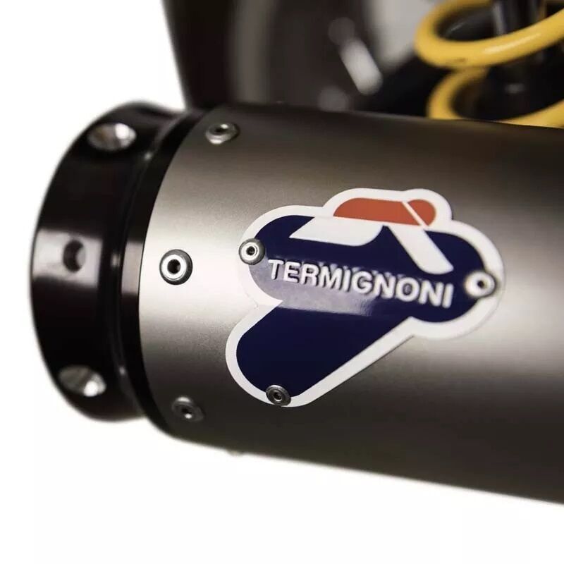 Supported vehicles: TRIUMPH THRUXTON 1200 2016-2020 SILENCER: T01008040IIA Homologated Silencers Couple Realized in Stainless Steel with Aluminium Endcap, Equipped with Riveted Metallic logo on Sleeve. Features: - Sleeve Material: Stainless Steel - Endcap Material: Aluminium A Termignoni silencer is a high-performance aftermarket exhaust component typically used on motorcycles, designed to enhance the bike's sound, performance, and aesthetic appeal. Termignoni is an Italian brand renowned for its high-quality exhaust systems, and their silencers are often featured in racing and performance applications.