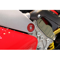 Frame caps set for Ducati Panigale and Streetfighter V4 machined from light alloy billet and then given an anodized surface finish.The kit consists of two plugs, supplied with specific screws for a precise and secure fixing on the frame. Please check Specifications for model compatibility.Delivery note: At Sportsbike, we offer a wide range of high-quality products, many of which are sourced directly from Europe. We have stock both in Australia and shipped in directly from Europe. Therefore, please allow 1-3 weeks for delivery. This ensures we can provide the best selection and service for your specific needs. We will confirm the ETA of shipping within 24-48 hours of an order being placed. Thank you for your understanding and patience!