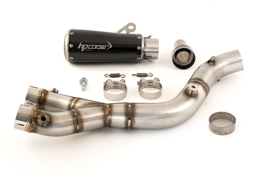BRAND: HP Corse SKU: XYAGP10R1BG-ACSingle low GP07 Black Satin Steel silencer, DB Killer version with anodized aluminum ring + 2-1 racing connection for original YAMAHA R1 2015-2017 collectors. Silencer not approved for road use ONLY FOR RACE