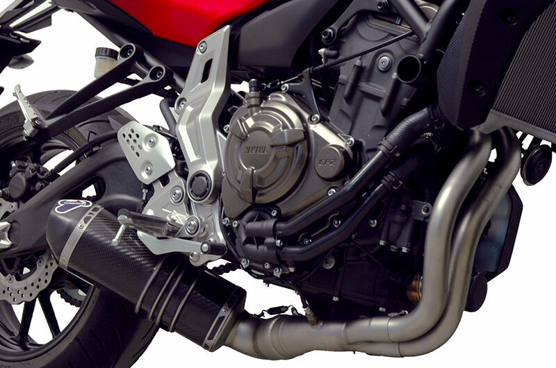 Approved Termignoni "Relevance" design carbon fiber muffler; stainless steel headers. This structure significantly reduces overall dimensions and weight. Termignoni offers its professionalism and the experience of its technicians to offer the best available on the aftermarket. As with all the exhausts in the Termignoni line, developed with the experience gained in MotoGP and Superbike, the R&D racing department works daily to reach the highest levels by enhancing the power and acceleration of each bike. Brand Yamaha Model MT-07 2014-2020 YEAR OF PRODUCTION 2014 - 2020 Product Code Y104090CV APPROVAL EURO 4 WEIGHT Weight difference compared to OEM -2 kg POWER [HP], Delta vs OEM MAX Gain 2.53 HP @ 8860 rpm TORQUE [Nm], Delta vs OEM Max Gain 1.95Nm@8770rpm MATERIAL MATERIAL Stainless Steel, Carbon