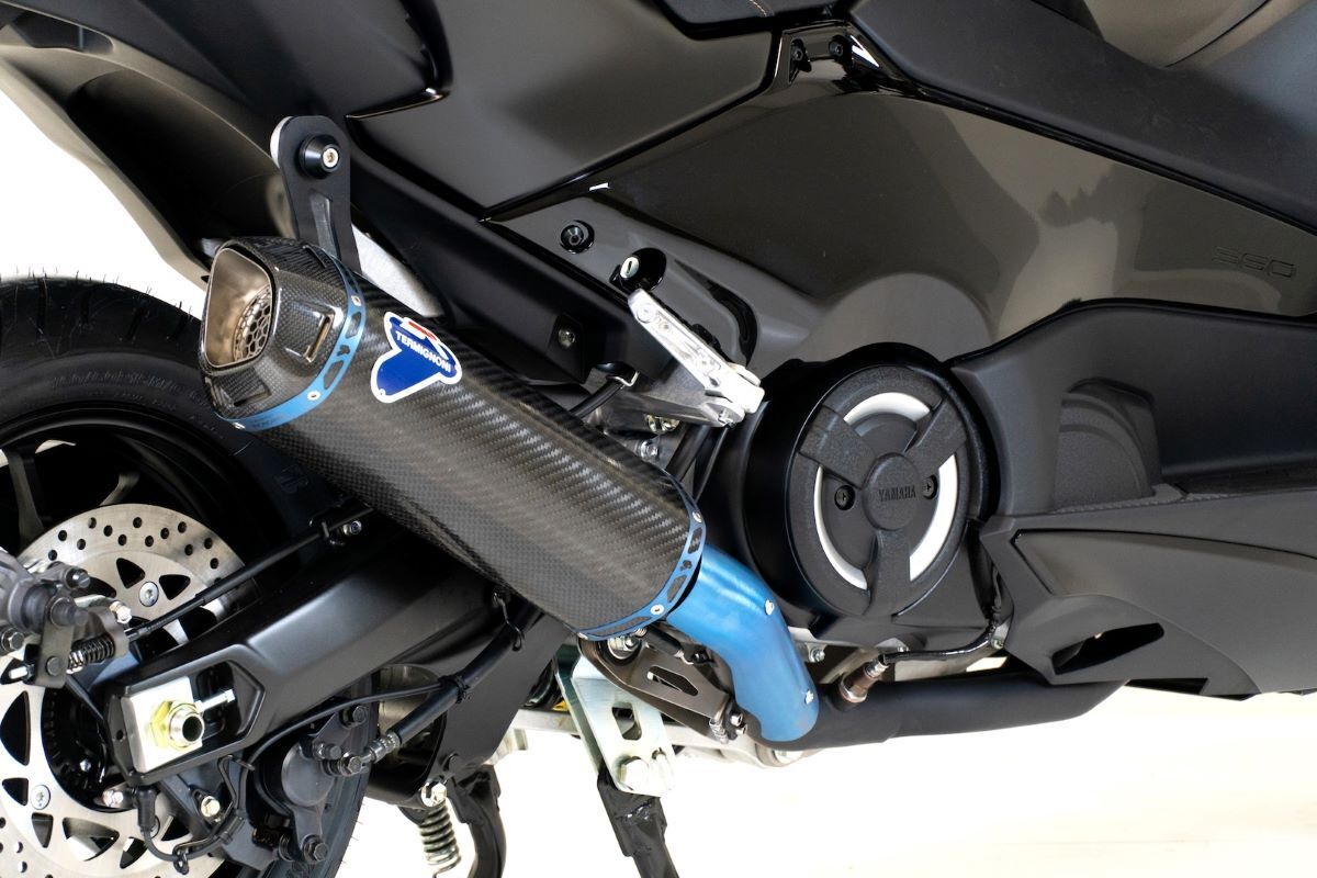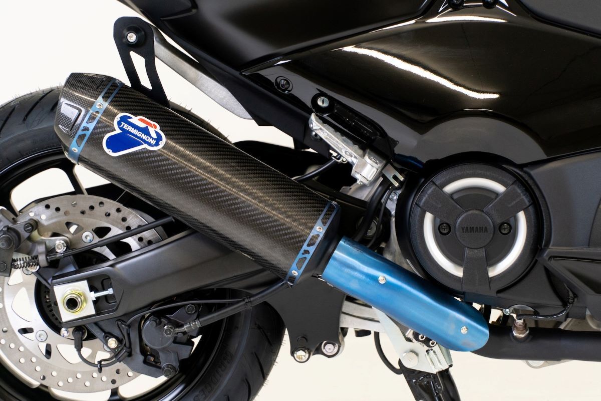 Supported vehicles: YAMAHA T-MAX 560 2022-2025 YAMAHA T-MAX 530 2022-2025 SILENCER: Y12609400BCC The complete system for T-MAX 560 is composed of a “Racing” silencer with carbon sleeve, carbon end cap, Blue titanium clamps, black painted stainless steel insert and the classic Termignoni Logo riveted to the silencer sleeve. The manifold assembly is in black painted stainless steel. A heat shield for the final body in Blue Titanium is supplied, which matches the Blue color of the silencer clamps. The Termignoni Logo with Titanium writing is lasered onto the heat shield. In Terms of Performance: - Weight Saving: - 4 Kg; - Power Gain: + 3 Cv (7500 Rpm); - Max Power: + 4,5 Cv (8500 Rpm); - Torque Gain: + 1,9 Nm; - Max Torque: + 3,5 Nm; Features: - Sleeve Material: Carbon; - Endcap Material: Carbon; - Headers Material: Stainless Steel; A Termignoni silencer is a high-performance aftermarket exhaust component typically used on motorcycles, designed to enhance the bike's sound, performance, and aesthetic appeal. Termignoni is an Italian brand renowned for its high-quality exhaust systems, and their silencers are often featured in racing and performance applications.