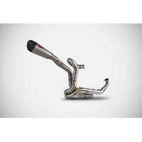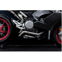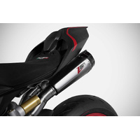 The Zard exhaust system dedicated to the Ducati Panigale V2 is a complete racing 2>1>2 system developed to ensure maximum performance, exclusive design and a unique sound. The two titanium silencers with carbon fiber end caps are repositioned under the tail, featuring an asymmetrical triangular profile that enhances the aggressive lines of the Panigale V2.