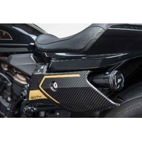 Made entirely of AISI 304 stainless steel, this 2 in 1 slip-on kit is characterized by the body of the oval and streamlined silencers, with diagonally cut, carbon fiber end caps, in addition to the refined matte black Cerakote® finish and the Zard logo laser-etched. The Zard “TOP GUN” exhaust for the Harley-Davidson® Sportster S 1250 is available in racing or Euro 5 homologated version and comes with the appropriate dB-Killer.