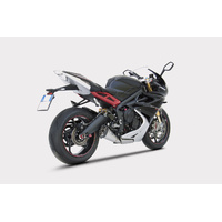 This slip-on, made of AISI 304 stainless steel, with a stainless steel sleeve and end cap available in either stainless steel or carbon fiber, features a compact and sporty design that enhances the aggressive profile of the Daytona 675. Designed for racing use, the system provides a significant weight reduction compared to the stock exhaust, along with an improvement in performance in terms of torque and power. Available in either satin or black finish.
