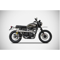 BRAND: Zard SKU: ZTP052S00SSR-BHThe “Special” high full kit for the Triumph Scrambler 900, entirely handmade in Italy, consists of a header and silencer made of AISI 304 stainless steel, with both sleeve and end cap in stainless steel. It is available in a satin, Cerakote® black finish, or with a black contrasting heat shield. The kit improves the bike’s performance with a significant power increase, a considerable weight reduction of -6.7 kg (-14.8 lbs), bringing it down to just 4.9 kg (10.8 lbs), and delivers a deep, distinctive sound.
