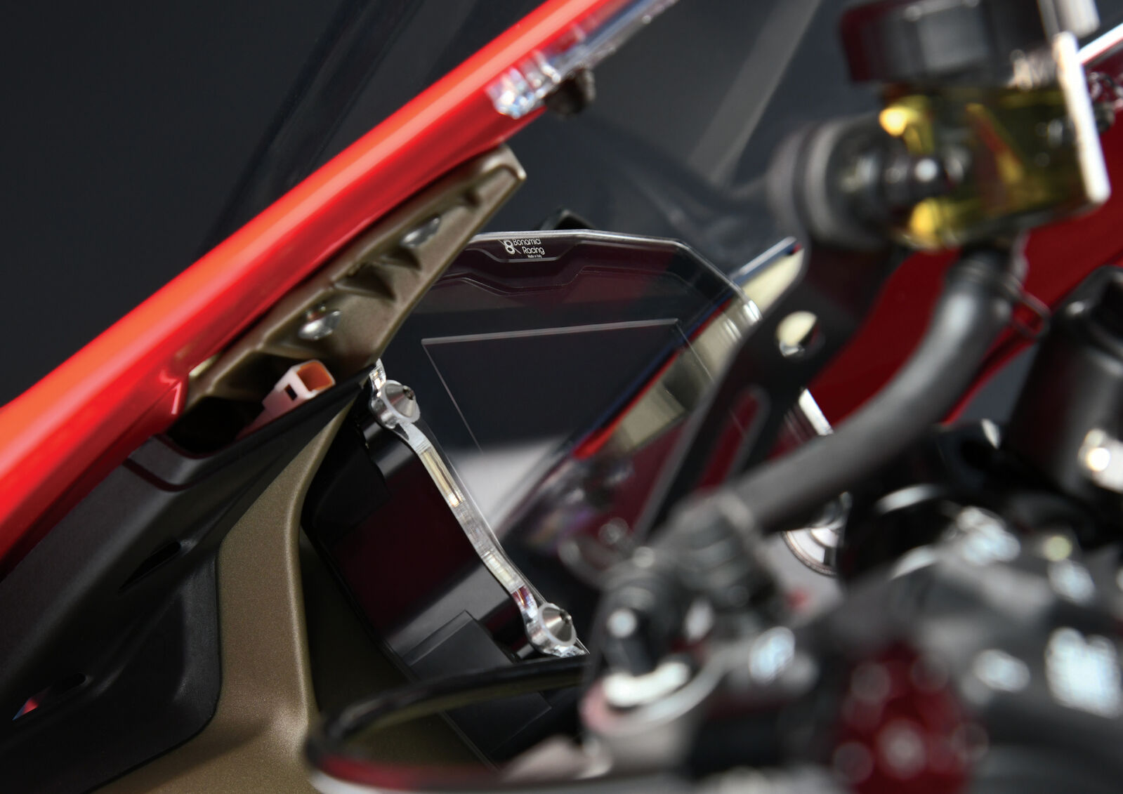 BRAND: Bonamici Racing SKU: DCP03This dash protector for the Panigale V4/R/S (up to 2024) is CNC machined from special aluminum that can absorb shocks and is resistant and safe.