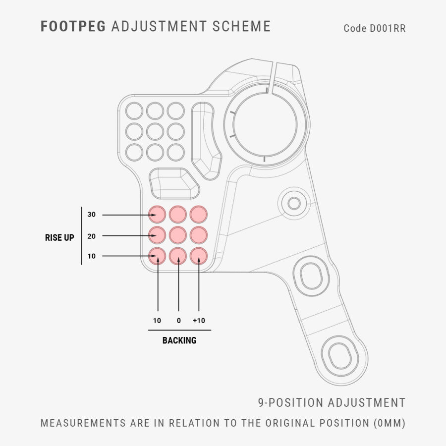 Precision CNC machined from high-strength aluminium alloys and finished in a durable black anodised coating, the PISTA EVO rearsets combine strength, lightweight performance, and long-term durability. The kit includes aluminium heel guards, racing footpegs, and adjustable toe pegs with rubber-coated sliding dowels for enhanced grip and fine adjustment.
