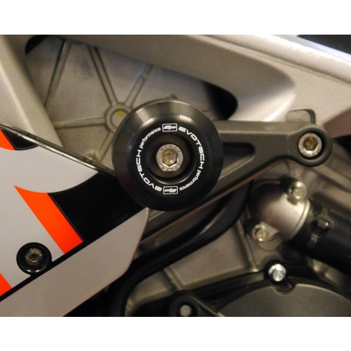 BRAND: Evotech Performance SKU: PRN011769-04Protect your RSV4 RF in the event of a fall (it happens to the best of us). These crash bobbins (frame sliders) have been made from high performance engineering polymer and the mounts are CNC machined from aircraft-grade aluminium and colour anodised.