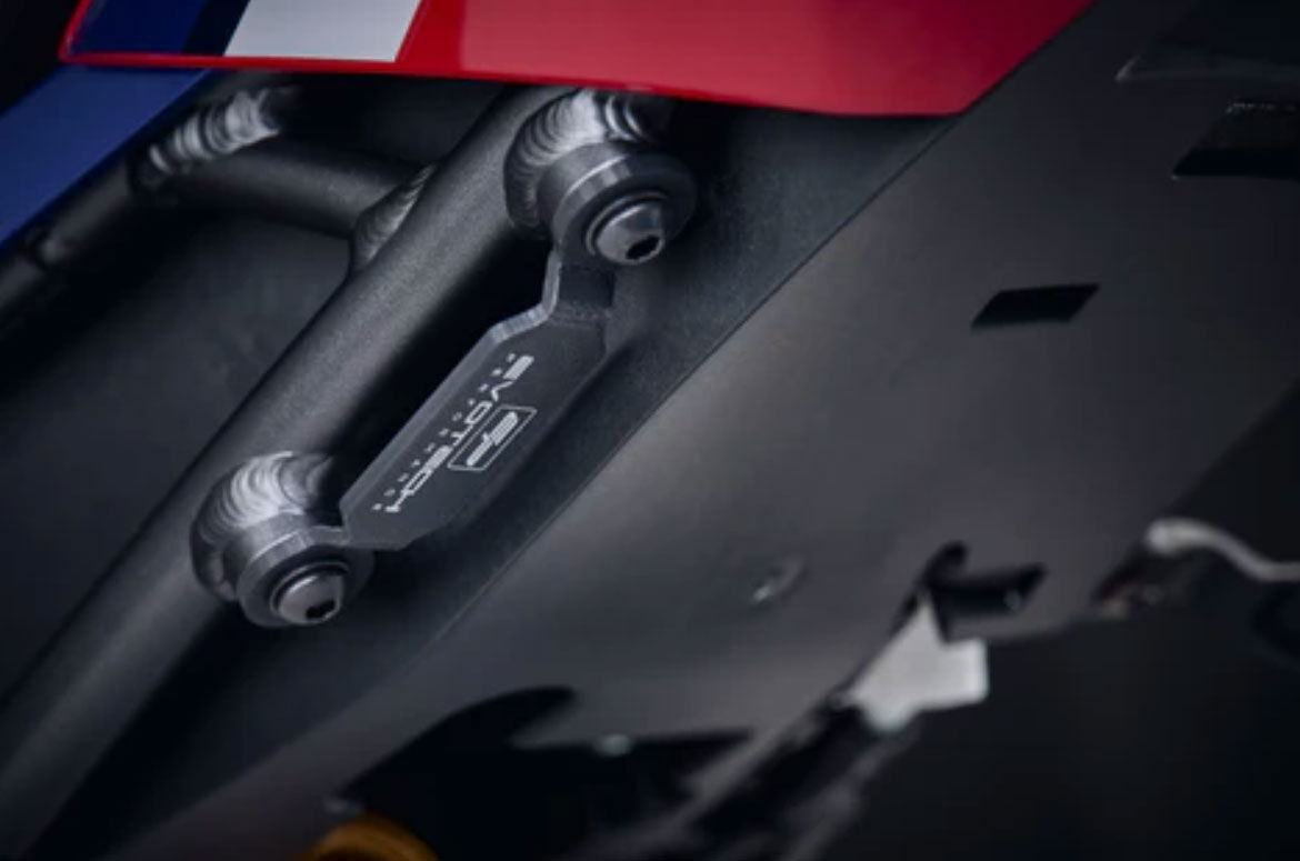 The Honda CBR1000RR-R SP is supplied from the factory with pillion footpegs. If these are no longer required, this Evotech kit provides a streamlined alternative. On the exhaust side, the hanger replaces the original pillion peg bracket while maintaining proper structural support for the exhaust system.