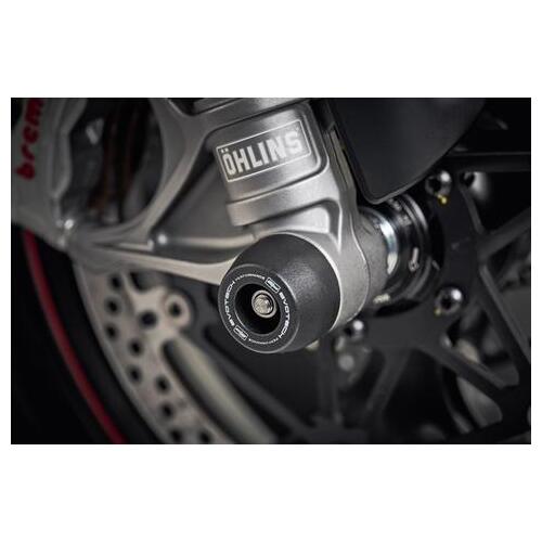 BRAND: Evotech Performance SKU: PRN011716-19These front axle sliders for the Panigale 959 Corse will help protect your forks and brake callipers when you have that inevitable fall. The innovative spindle bobbin system from Evotech Performance allows the bobbin head to move on impact and has an aluminium spacer system that offers a solid core for the nylon bobbin head's position.